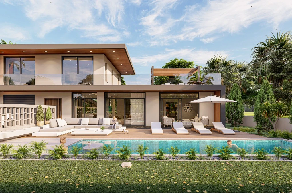 6 Häusern jeweils mit eigenem Pool, je 3 Auto Stellplätzen, davon eine Garage.
